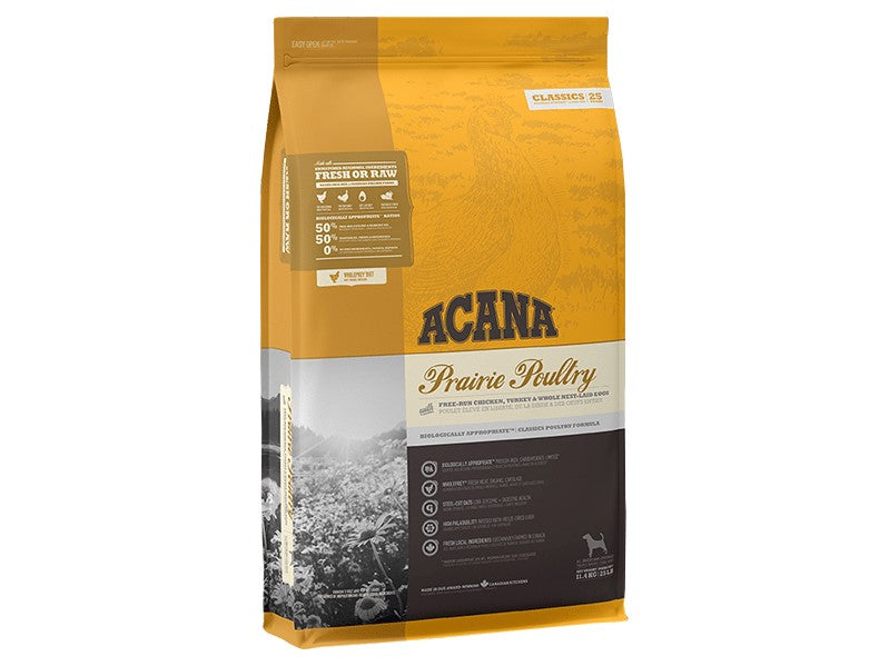 Loaded with nourishing meat protein, ACANA Prairie Poultry features free-run chicken and turkey plus whole nest-laid eggs, delivered FRESH or RAW daily in WholePrey ratios, from local prairie farms. Free of high-glycemic carbohydrates, ACANA Classics feature low-glycemic and locally grown steel-cut oats that help promote stable blood sugar and peak physical conditioning.