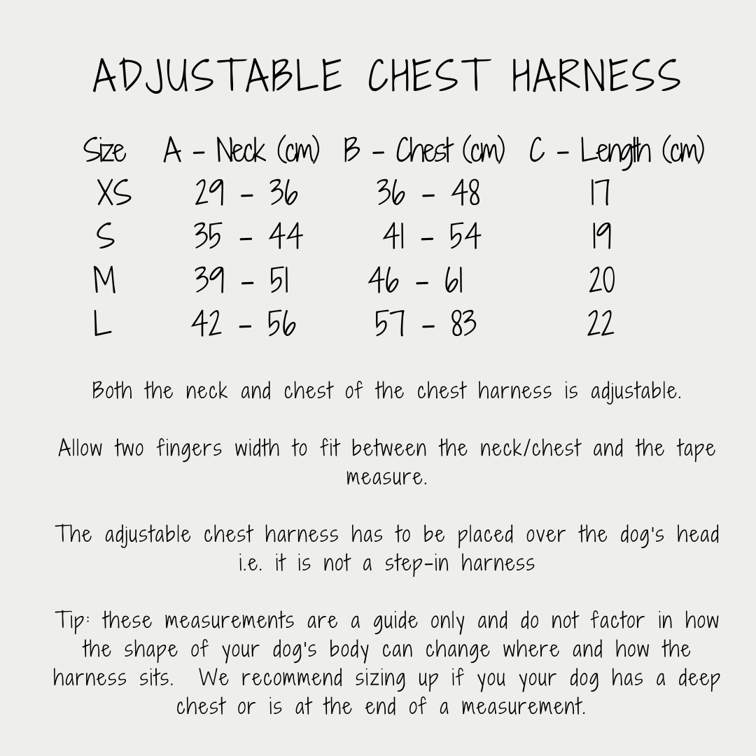 * Fully adjustable weave printed polyester neck and chest straps to ensure the perfect fit