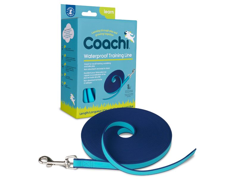 The Coachi Waterproof Training Line, allows you to safely train your dog to return to you when called in open spaces. This training line allows you to give your dog more freedom outdoors whilst keeping control in new situations. Ideal for socialising a puppy or new dog, this line features a waterproof outer that keeps the line dry for better grip and easy cleaning. This 10m line is best suited to large puppies and dogs.