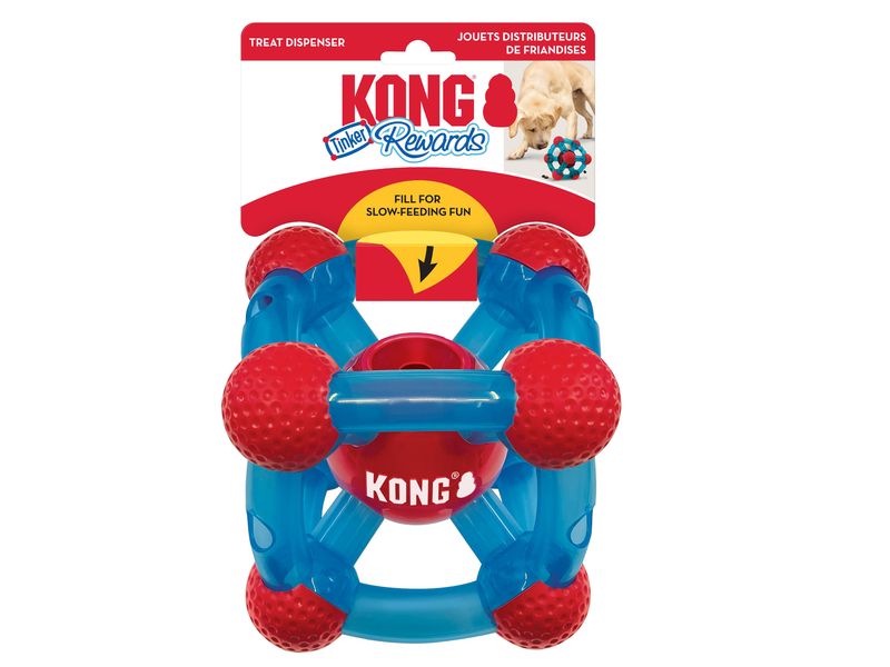 KONG Rewards Tinker randomly dispenses treats through holes in 6 different spots, increasing the irresistible unpredictability that keeps dogs riveted. Tinkering around with the toy moves kibbles through the tubes, releasing them as it rolls and bounces. Funnel makes it easy to fill with 1 cup of food for a mentally stimulating feast. Use for meals to help manage weight. Corners mute play for quieter action.